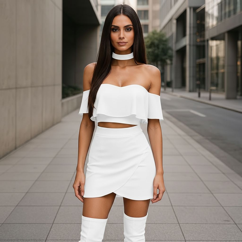 Този бял празничен комплект съчетава елегантност, финес и модерна визия – идеален избор за сезонa на светлините. Бюстието е с красив волан и паднали ръкави, които подчертават раменете и създават изискан, женствен силует. Мини полата е изработена от мека и еластична материя, която приляга по тялото и подчертава линиите по деликатен и стилен начин.