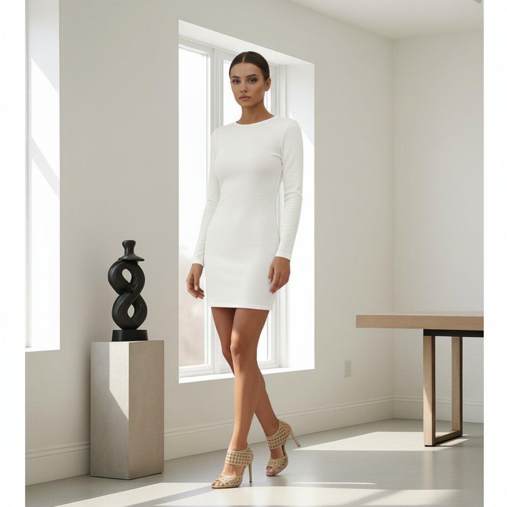 Мини кройката създава ясно изразена линия, а дългите ръкави придават завършен и елегантен външен вид. Белият цвят носи усещане за чистота и съвременна естетика, което прави роклята подходящ избор за коктейли, официални събития, партита и фотосесии.