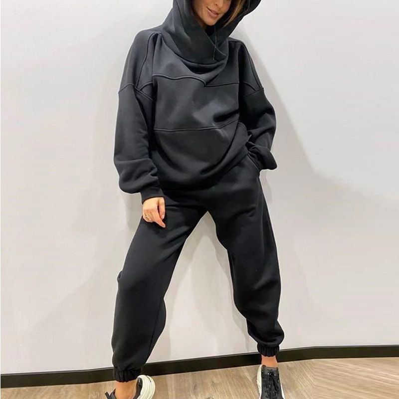 Стилен и удобен дамски черен спортен комплект с качулка и долнище с ластик – идеален за ежедневие, спорт и пълен комфорт.
