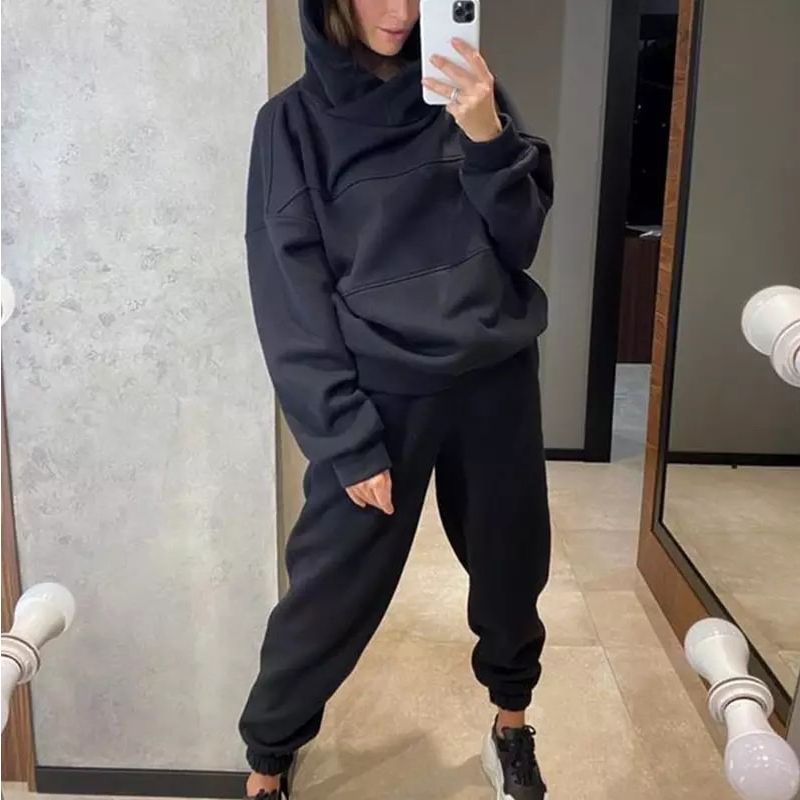 Този дамски черен спортен комплект е перфектният избор за жени, които ценят едновременно стила и удобството. Изработен от мека и висококачествена материя, той включва удобна oversize блуза с качулка и практично долнище с ластик в талията и глезените. Съчетава се лесно със спортни обувки и е подходящ както за разходки и тренировки, така и за комфортно ежедневие у дома. С този комплект ще изглеждате модерно, докато се чувствате напълно удобно.