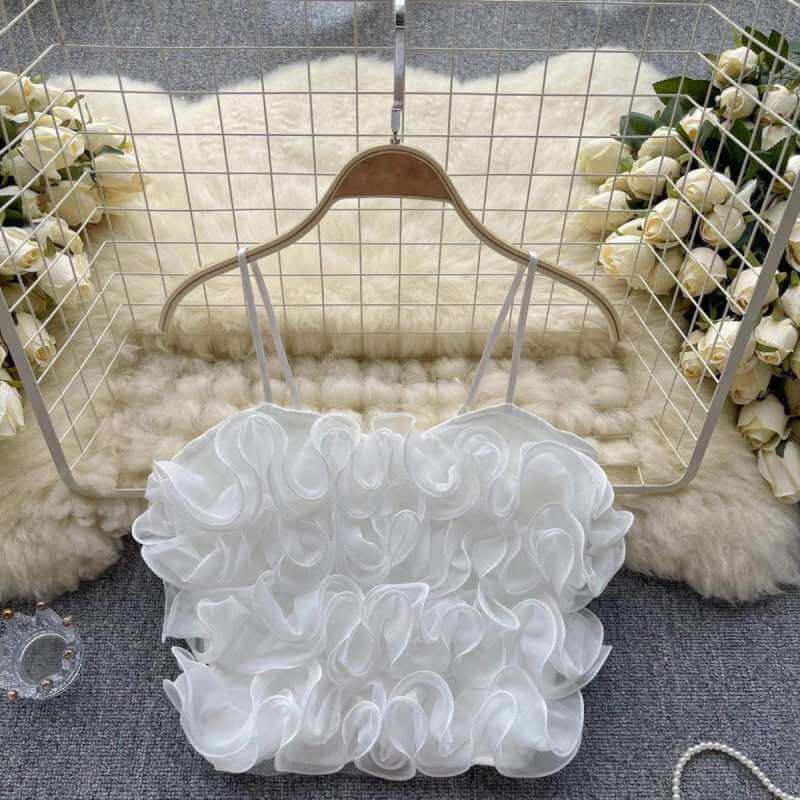 - Минималистичен акцент: Фините и тънки презрамки подчертават раменете, превръщайки модела в перфектния къс бял топ с тънки презрамки за топлите месеци.