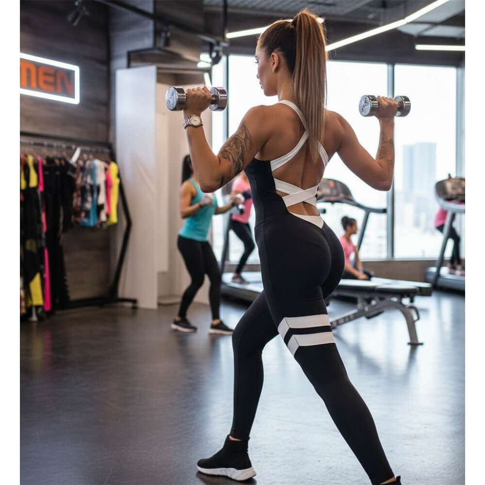 Основният акцент е върху кръстосаните бели ленти, които не само изглеждат зашеметяващо, но и осигуряват допълнителна опора. Като типичен дамски спортен гащеризон от висок клас, материята е дишаща и бързосъхнеща, което го прави идеален за най-горещите моменти в залата. Този гащеризон спортен гарантира, че ще се чувствате уверени, независимо от интензивността на упражненията.