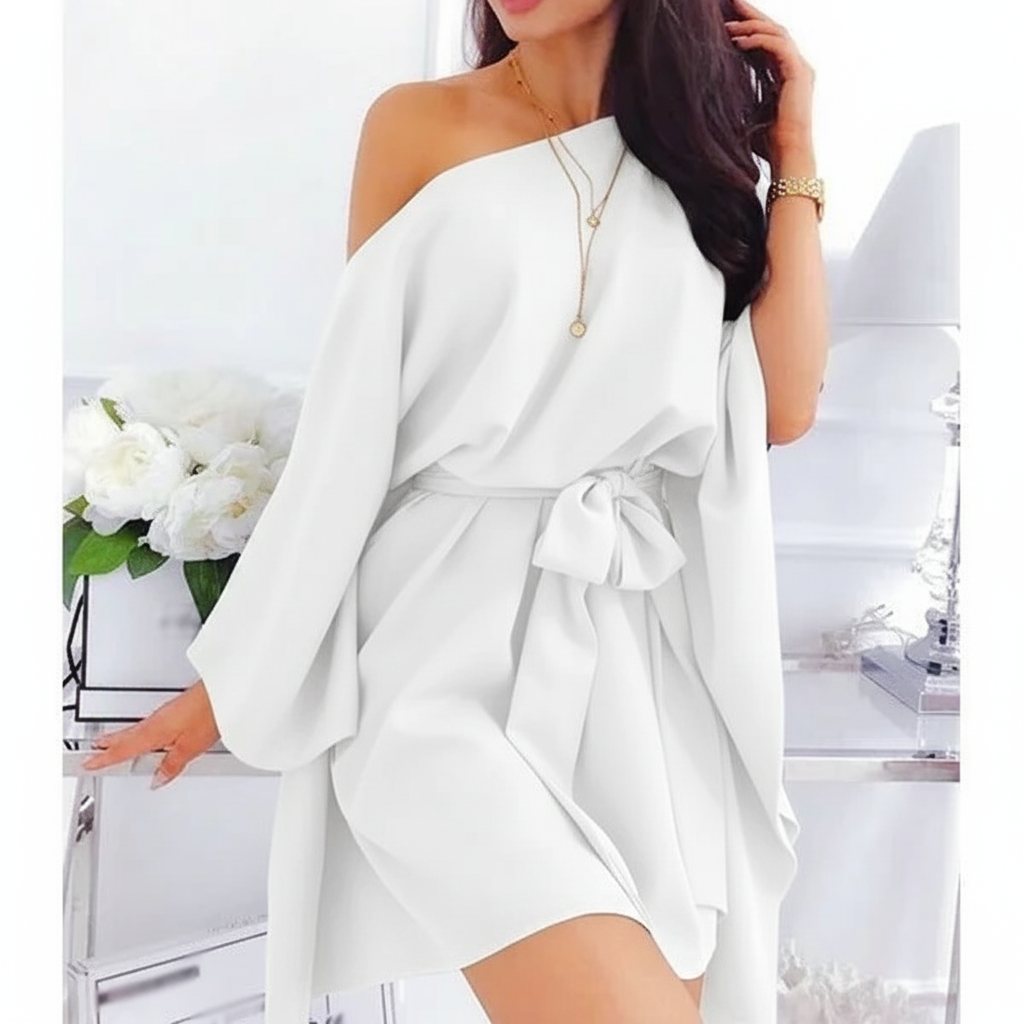 Αυτό το λευκό ασύμμετρο φόρεμα με έξω τους ώμους εντυπωσιάζει με τον καθαρό σχεδιασμό και τη μοντέρνα σιλουέτα του. Το χαλαρό, αέρινο τοπ δημιουργεί μια αίσθηση ανάλαφρης αίσθησης και άνεσης, ενώ η ασύμμετρη λαιμόκοψη προσθέτει μια κομψή και μοντέρνα πινελιά στην εμφάνιση.