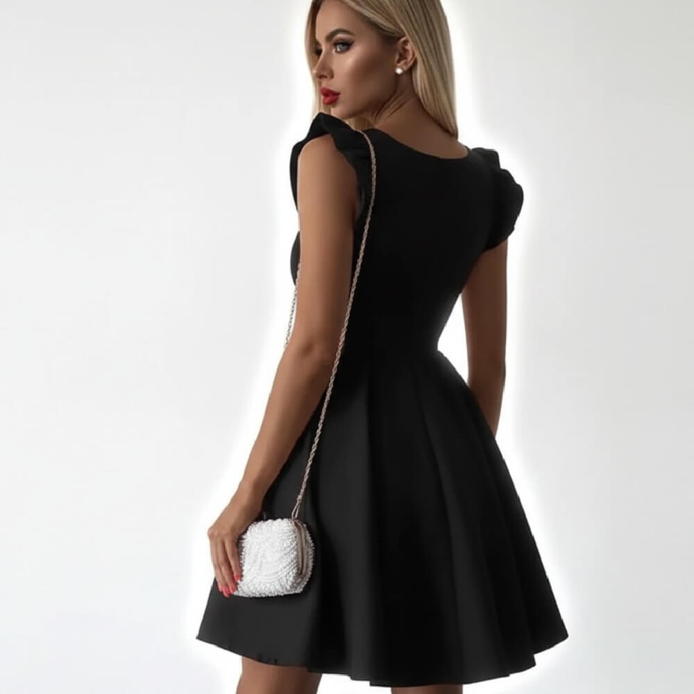 Μαύρο φαρδύ φόρεμα με βολάν στους ώμους – Ρομαντισμός και Κλάση