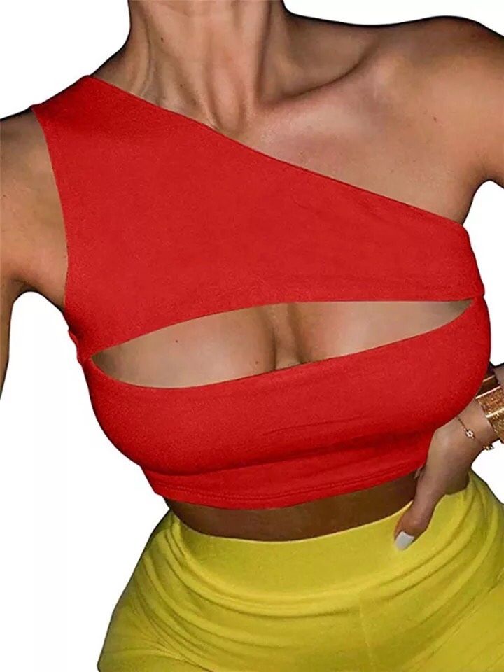 Κόκκινο γυναικείο τοπ με έναν ώμο και λεπτομέρεια κοψίματος C0545