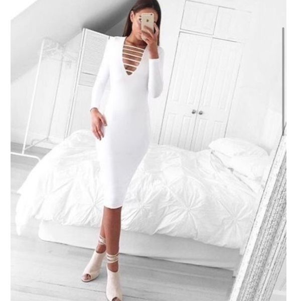 Бяла елегантна рокля с дълъг ръкав и дълбоко деколте с връзки C0330