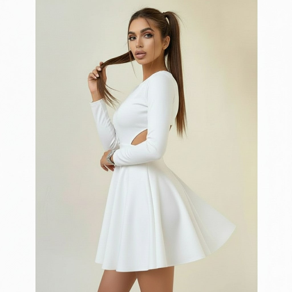 Открои се с изисканост и елегантност с тази бяла рокля с разкроена пола и стилен страничен отвор. Моделът комбинира класически силует с модерна визия, подчертаваща талията и извивките по един фин и женствен начин. Дългият ръкав добавя нотка изтънченост, а меката материя осигурява комфорт през целия ден или вечер. Перфектният избор за специален повод, коктейл, празник или просто когато искаш да се почувстваш уверена и стилна.