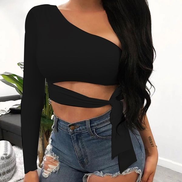 Черен асиметричен топ с дълъг ръкав и връзка C0501