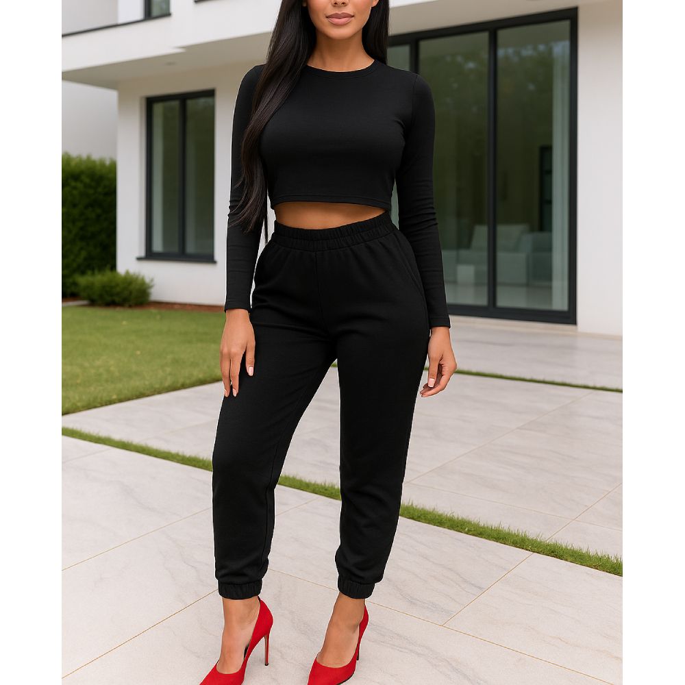 Елегантният черен спортен комплект е задължителен елемент в гардероба на всяка модерна жена. Горнището е късо с дълъг ръкав, а долнището е с удобен ластик на талията и глезените за перфектно прилягане. Подходящ както за ежедневни излизания, така и за спорт или разходки, този комплект съчетава комфорт и изчистена визия. Черният цвят го прави лесен за комбиниране с всякакви обувки и аксесоари.