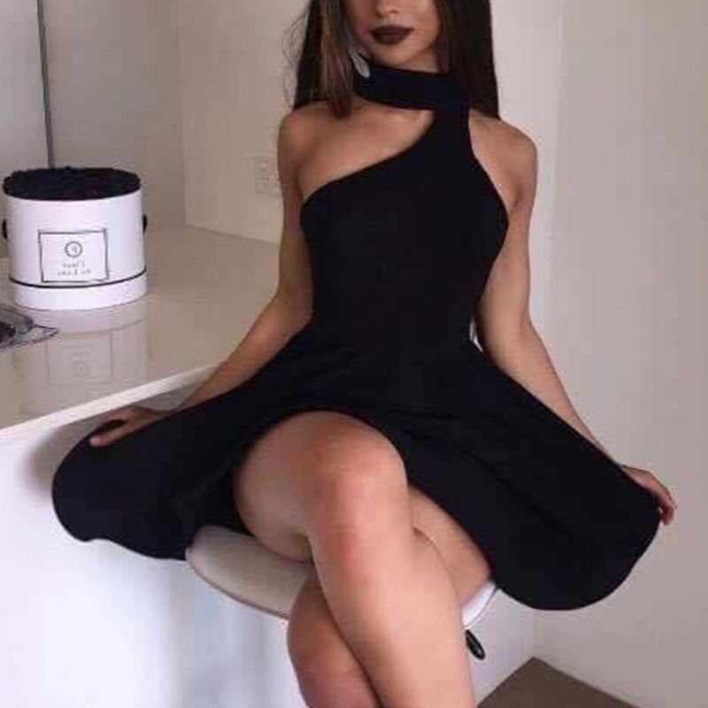 Черна асиметрична рокля с висока яка и разкроена пола C0396