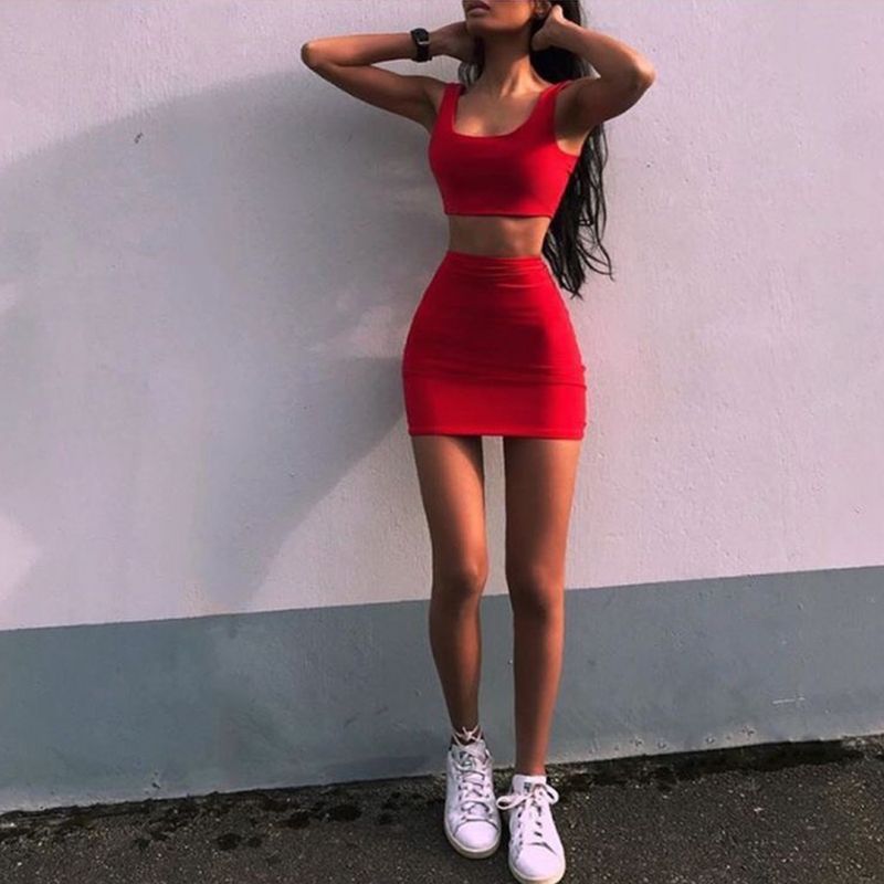 Червен спортно-елегантен комплект с кроп топ и мини пола C0435