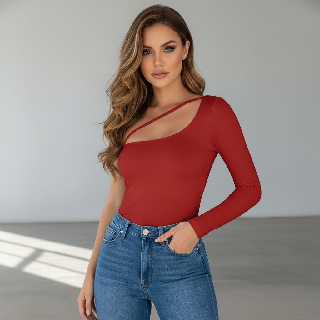 Червена дамска блуза с асиметрично деколте и един ръкав C0503