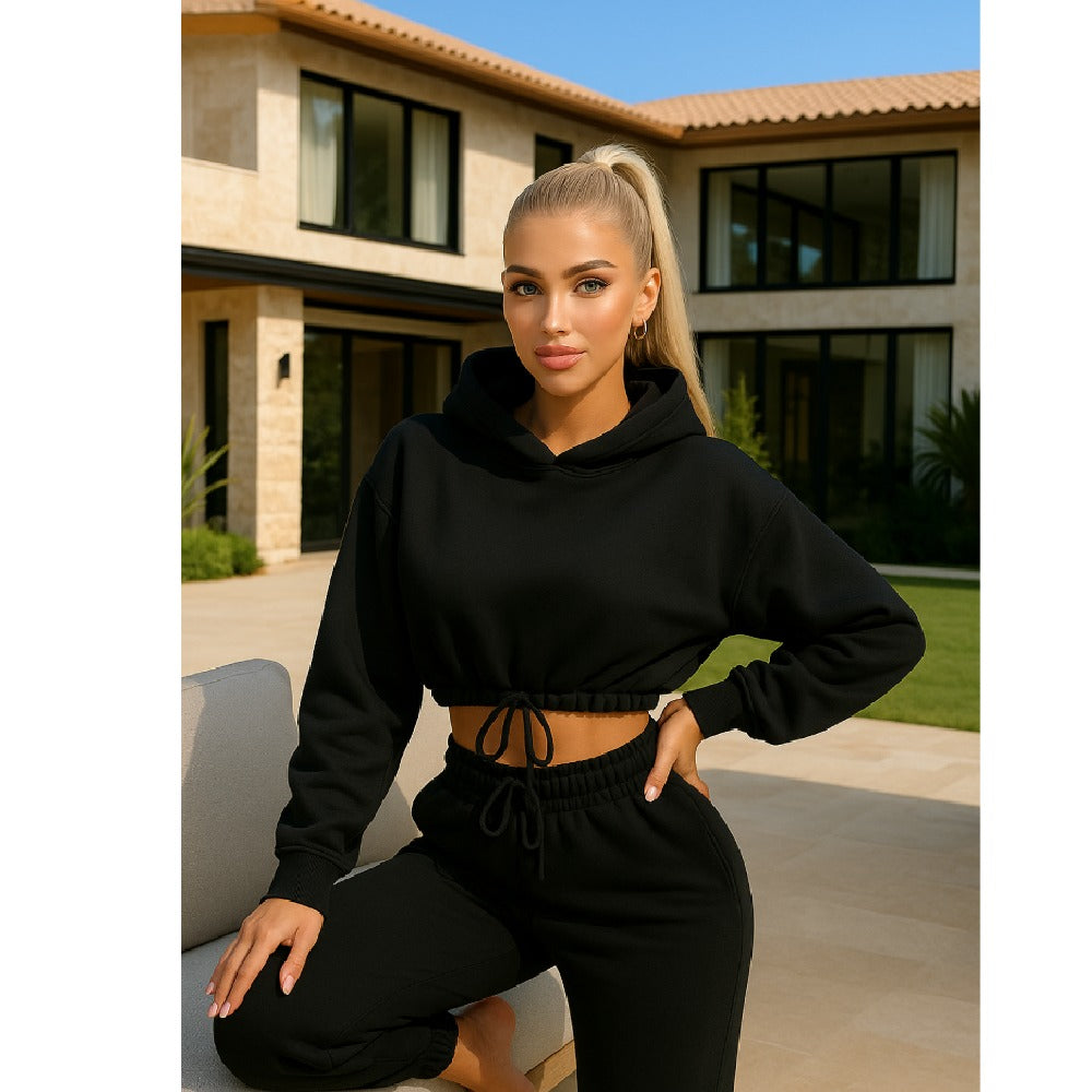 Стилен дамски черен спортен комплект с късо горнище и качулка – модерен избор за спорт, разходка или ежедневие.