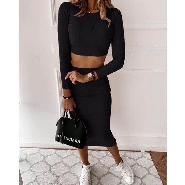 Ежедневен черен комплект с дълъг ръкав и миди пола C0216