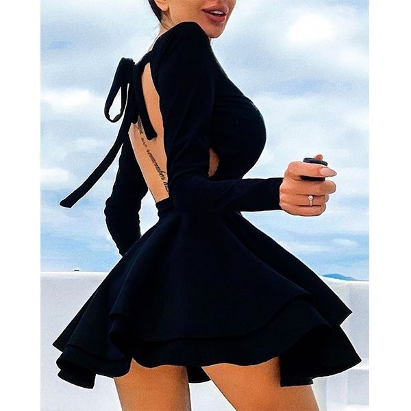 Къса черна рокля с дълъг ръкав и гол гръб C0285
