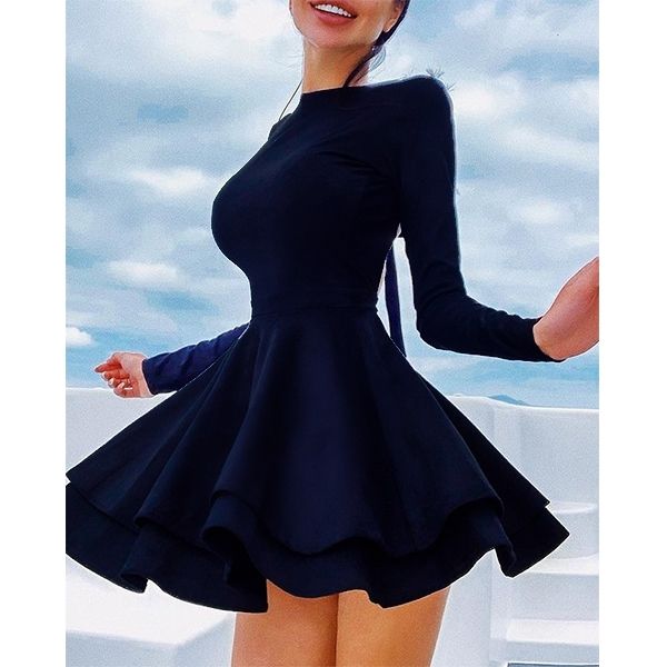 Тази къса черна рокля е перфектният избор за специални поводи, когато искаш да съчетаеш елегантност и женственост. Моделът е с дълги ръкави и разкроена двуслойна пола, която създава ефектен и изискан силует. Гърбът е открит и завършва с деликатна панделка, която придава стилен акцент и усещане за изтънченост. Материята е удобна и създава свобода на движение, което прави роклята подходяща за партита, коктейли и романтични вечери.