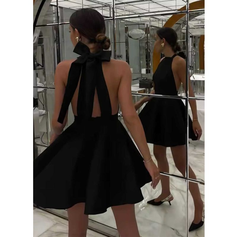 Къса елегантна черна рокля с гол гръб и панделка C0284